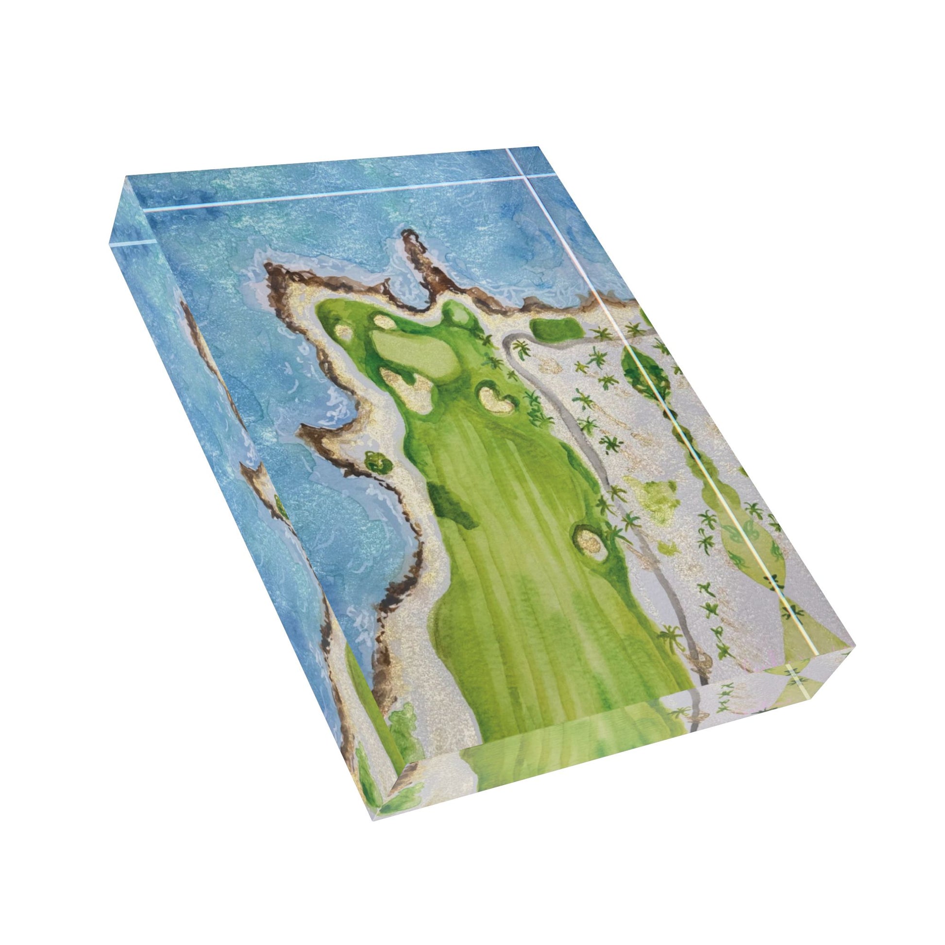 ”Golf courses are always so beautiful and when I saw a birds-eye-view of one on the ocean, I had to paint it.”
